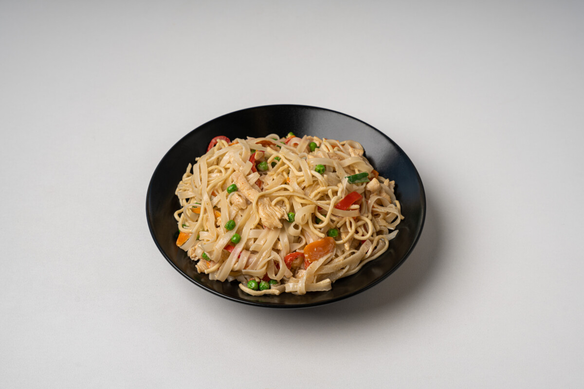 Thai egg and rice noodles wok with coconut milk, peas, carrots, red peppers, chili and spring onions.