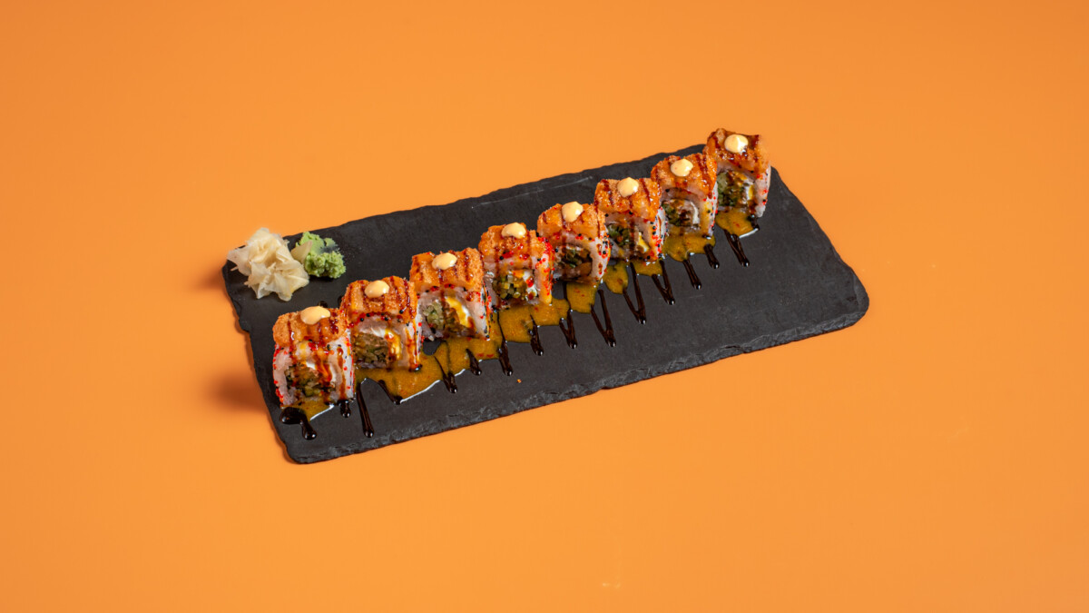 Rolls with tempura shrimp, cucumber, fried onion, Philadelphia cheese, black and white sesame, chili mayo, ebi katsu and unagi sauce.