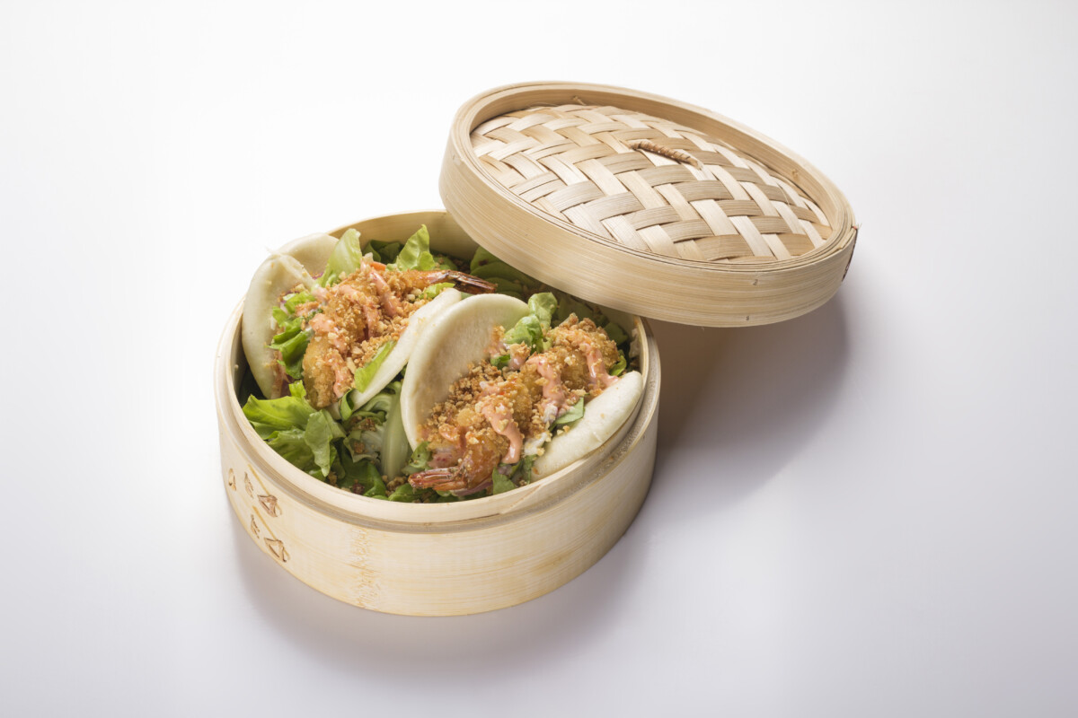 Tempura shrimp, Kimchi slaw vegetables, homemade cucumber pickle, chili garlic mayo. Crushed nuts, fried onions and chives on top . (2pcs)
