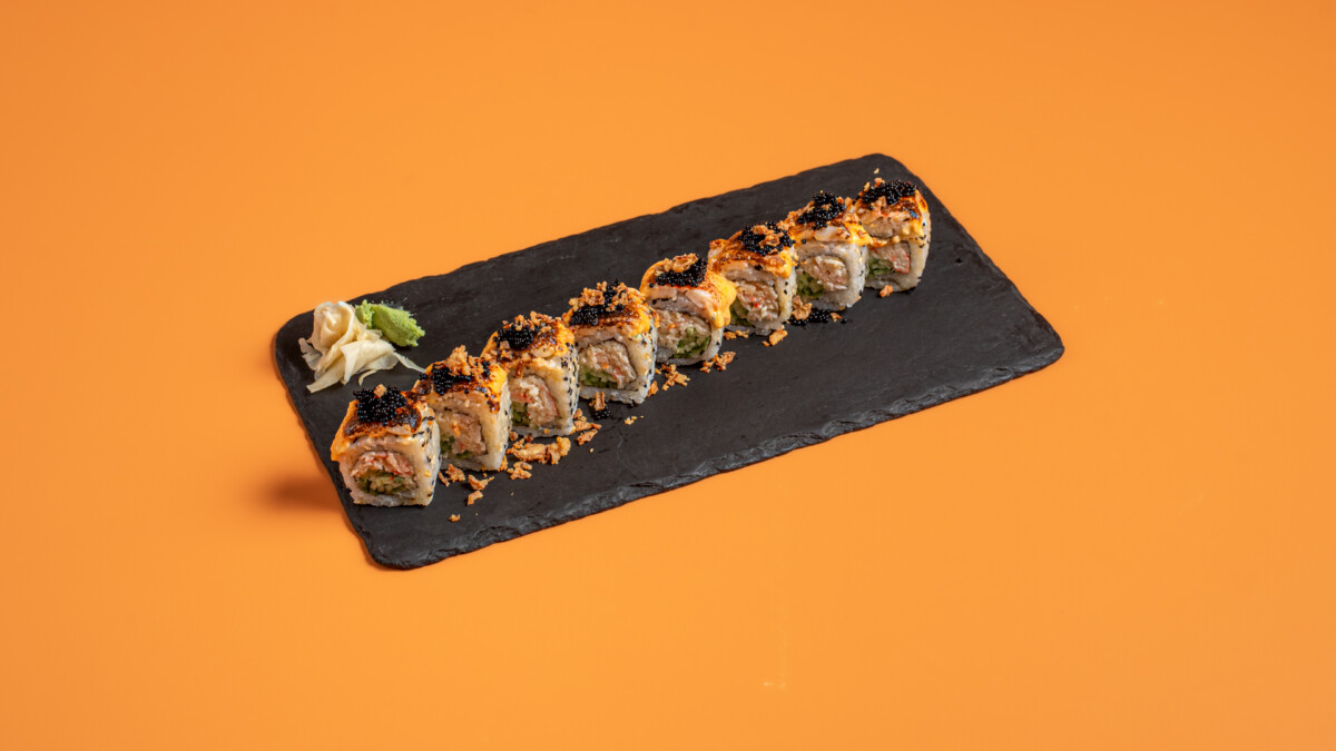 Rolls with burnt shrimp, chili mayo, cucumber, black tobiko, fried onion and black and white sesame.
