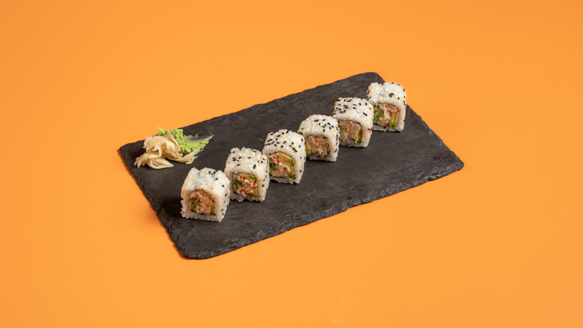 Rolls with crab and mayo, avocado, cucumber, white and black