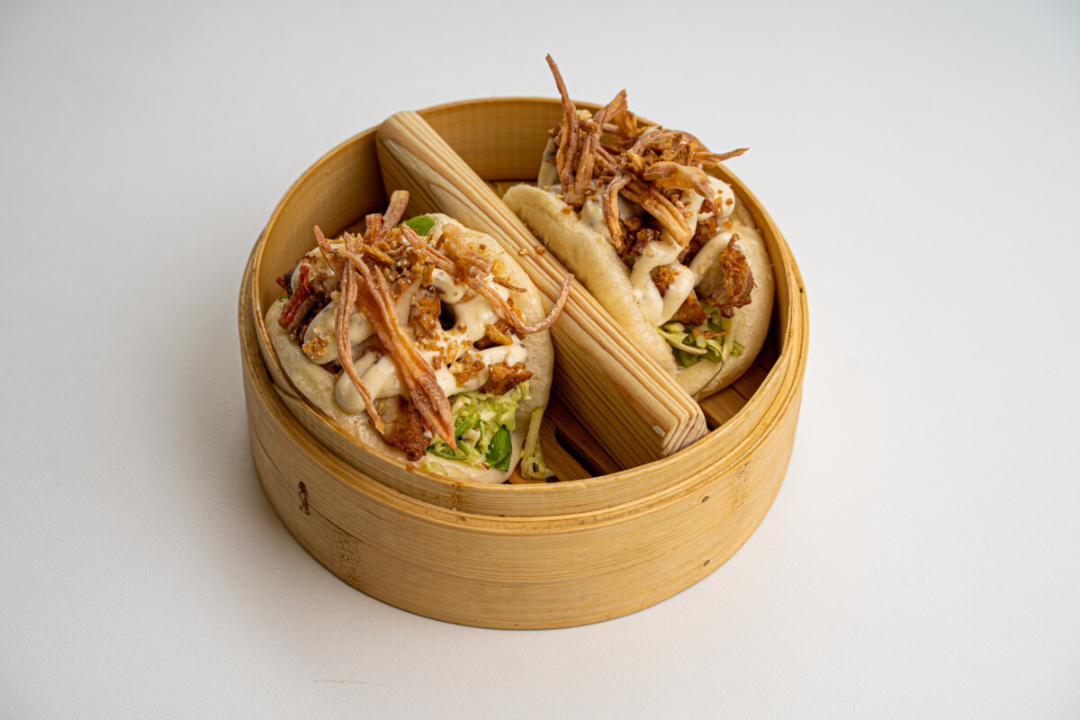 Chicken yakitori, Kimchi slaw vegetables, truffle mayo and fried crab. Crushed nuts and fried onions on top. (2pcs)