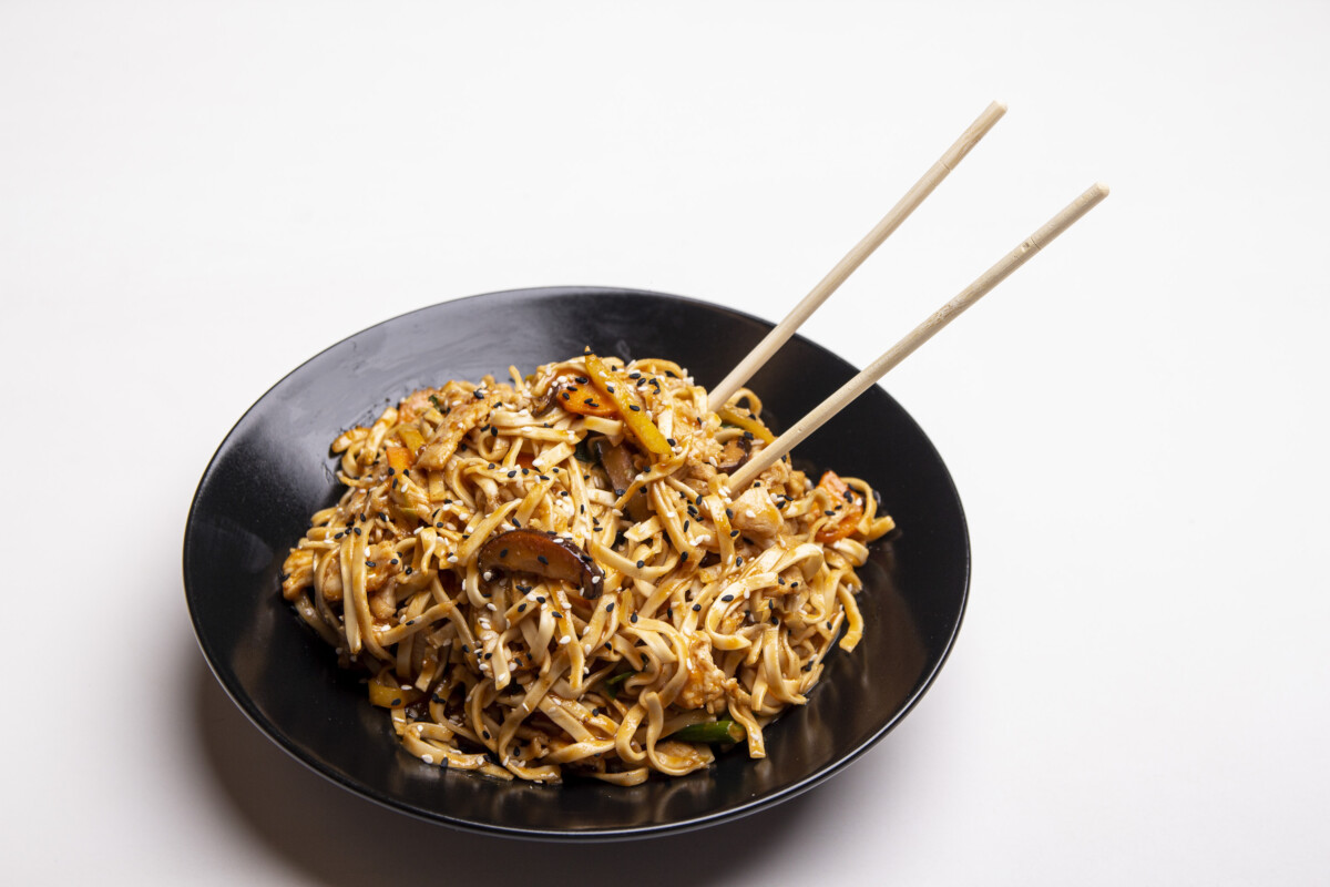 Flat egg noodles wok with cabbage, spring onion, carrot, mango, black and white sesame, shitake mushrooms and Gochuchang sauce.