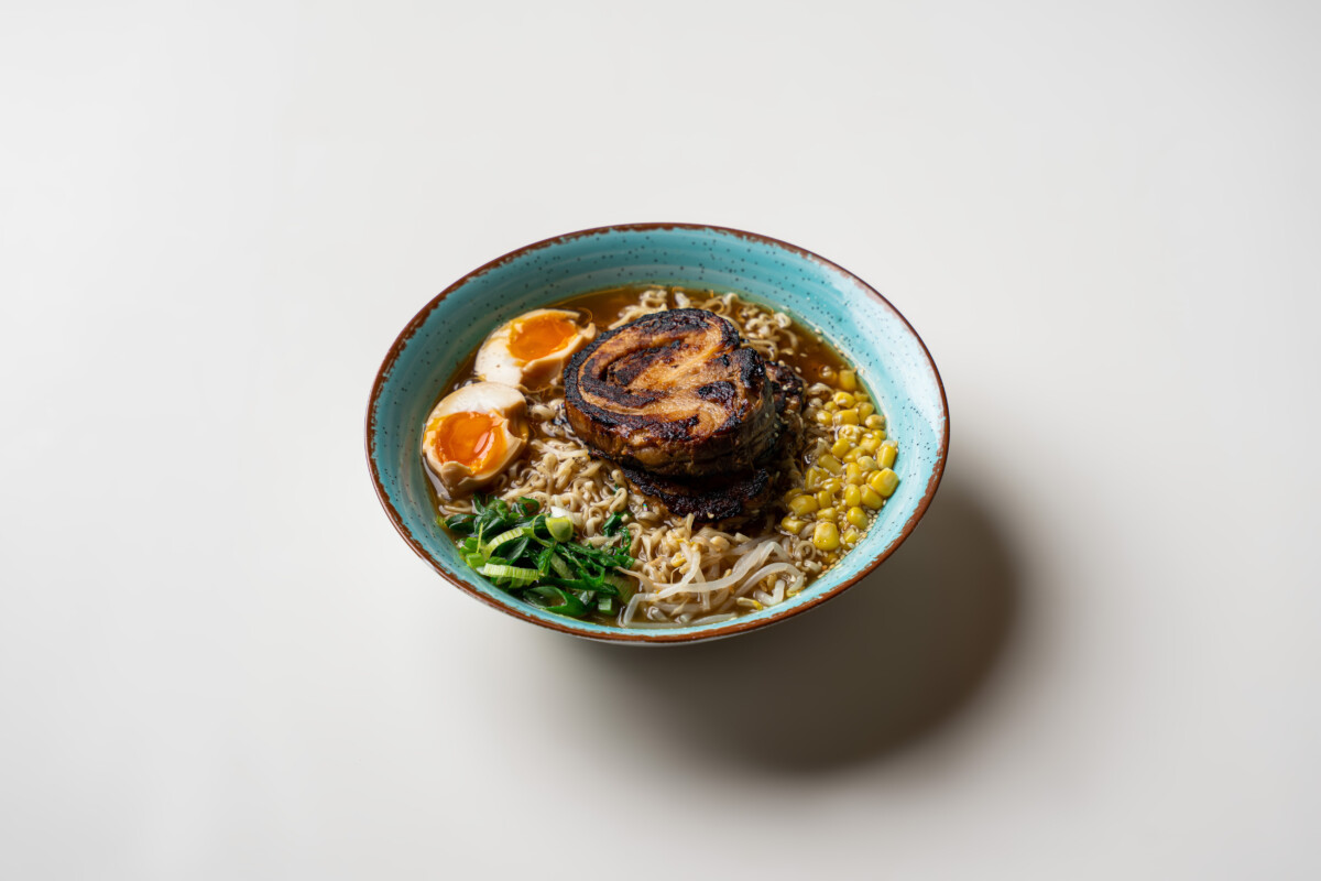 The famous Asian soup with pork broth, mendake noodles, chashu pork roll, bean sprouts, spring onions, corn and ramen egg. Served with white sesame and flavoured oil Asian House.