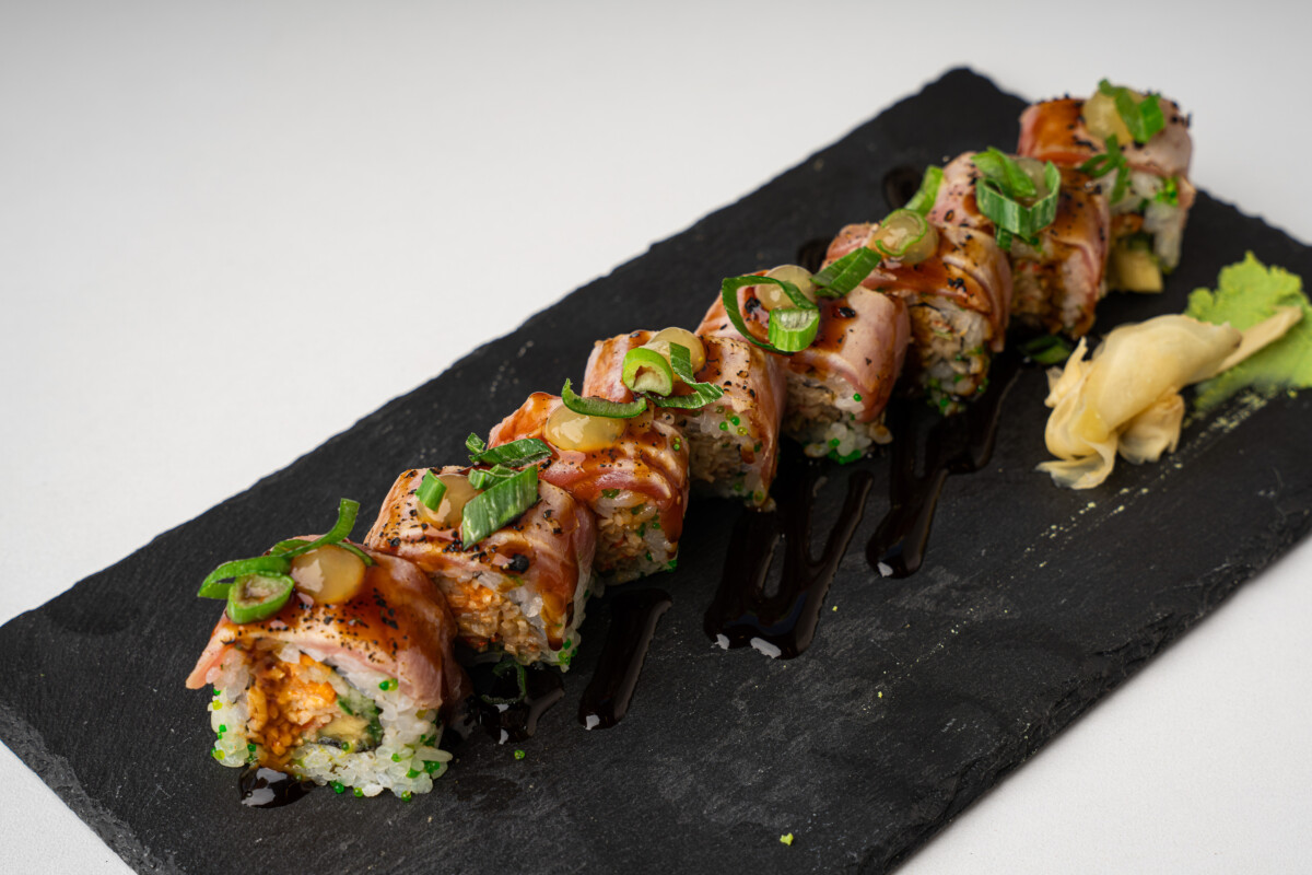 Rolls with spicy crab, blackened tuna with szechuan pepper, cucumber, avocado, carrot, fresh onion, unagi sauce, spicy mayo, green tobiko and yuzu mayo dots.
